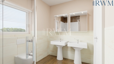 Auf einen Blick: • Ideal für Kapitalanleger durch degressive Afa 5 % • Schlüsselfertiger Neubau • Voraussichtlich bezugsbereit im 1. Quartal 2026 • Zentrale Lage, fußläufig zur Nahversorgung • Moderne & hochwertige Ausstattung • Süd-West-Balkon • Energieeffiziente Bauweise nach GEG 2020 • Voraussichtliche Energieeffizienzklasse A+ • Aufzug in alle Geschosse (Außer DG2) • Großzügige Zimmeraufteilung, offener Küchenbereich • Fahrradabstellboxen vor dem Gebäude • Gemeinschaftliche Waschküche • ein Stellplatz in der Doppelpark-Garage zusätzlich erwerbbar • Kellerraum und Waschküche barrierefrei über Aufzug erreichbar Rohbau: • Wohngebäude in Massivbauweise, tragende Wände und Decken aus Stahlbeton • Nicht tragende Innenwände aus Gipsdielen • Dach & Außenwände erhalten ein Wärmedämmverbundsystem • Satteldach aus Holzkonstruktion und Beton-Dachsteinen • Alle Wohnungen entsprechend den Effizienzhaus Anforderungen (GEG 2020). Jeder Erwerber erhält hierüber einen Energieausweis • Aufzugsanlage vom UG bis DG1 mit schwellenfreiem Zugang zu den Treppenhäusern • Fahrradbox ebenerdig außerhalb des Gebäudes Ausbau: • Kunststofffenster, 3-fach-Wärmeschutzverglasung in den Wohngeschossen • Elektrisch betriebene Kunststoffrollläden an allen Wohnungsfenstern • Wohnungseingangstür aus Holz mit Türspion, Schallex-Dichtungsleiste, Schalldämmung nach DIN, Profilzylinderschloss mit Schließanlage • Innentüren in Ausführung weiß • Parkett in Ausführung Eiche-Schiffsboden-Fertigparkett natur und Fliesen nach Wahl • Weißer Dispersionsfarbanstrich der Wände und Decken auf Raufasertapete • Estrich auf Trittschall- und Wärmedämmung in den Wohnbereichen • 2 Vierfach-Parker mit elektrischen Rolltoren inkl. Schlüsselschalter Haustechnik: • Verchromte Armaturen als Einhebelmischer • Weiße Sanitärkeramik (Villeroy & Boch) • Wohnraumlüftung, Ausführung mit Regel-air®FFL Fensterfalzlüfter. • Fußbodenheizung in den Wohnräumen mit Einzelraumthermostaten • Großflächenschalter- und Steckdosenprogramm, Farbe alpinweiß • Türöffner, Klingelanlage und Gegensprechanlage • Warmwasser-Zentralheizung und -Bereitung über Luft-Wasser-Wärmepumpe und Brauchwasserspeicher Außenanlagen: • Betonplatten mit Granitaufsatz lose in Riesel verlegt als Balkon-/Terrassenbelag; auf den Terrassen mit Mineralbeton-Unterbau • Geschlossene Beton-Müllboxen am Hauszugang • Graue Beton-Pflastersteine auf Mineralbeton verlegt verlegt im Hof, der Kinderwagen-Einhausung und auf dem Hauszugang Erschließung: • Erstmalige Anschlussgebühren und Beiträge für Wasser, Strom, Abwasser sind im Kaufpreis enthalten • Die komplette Durchführung vom Kaufvertrag bis hin zur schlüsselfertigen Übergabe erfolgt durch die RWM Immobilien GmbH
