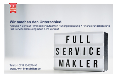 Haben wir Ihr Interesse geweckt oder haben Sie weitere Fragen? Überzeugen Sie sich vor Ort bei einer individuellen Besichtigung. Oder erhalten Sie über folgenden Link einen ersten Eindruck der Immobilie - virtueller 360°-Rundgang: https://realwertemanagement.sharepoint.com/:v:/g/RemaxStuttgartMitte/ERyYDpZgiyxBsK5OpNTsT08BoYP4F_8KLFVrWhiPZn4yCQ?e=edyqat Gerne stehen wir Ihnen persönlich zur Verfügung: Telefon +49 711 184 278 76 Mobil +49 173 586 62 57 E-Mail domenico.mandaglio@rwm-immobilien.de Weitere Angebote erwarten Sie auf unserer Homepage: www.rwm-immobilien.de Alle im Exposé enthaltenen Angaben beruhen auf Aussagen des/der Eigentümers/Eigentümerin. Irrtümer vorbehalten. Unsere Angebote sind freibleibend und in diesem Falle nur für Sie bestimmt. Eine Weitergabe an Dritte bedarf unserer Zustimmung.