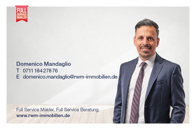 Haben wir Ihr Interesse geweckt oder haben Sie weitere Fragen? Überzeugen Sie sich vor Ort bei einer individuellen Besichtigung. Gerne stehen wir Ihnen persönlich zur Verfügung: Telefon +49 711 184 278 76 Mobil +49 173 586 62 57 E-Mail domenico.mandaglio@rwm-immobilien.de Weitere Angebote erwarten Sie auf unserer Homepage: www.rwm-immobilien.de Rechtlicher Hinweis: Dieses Exposé dient der allgemeinen Information und stellt keine Beschaffenheitsvereinbarung, Garantie oder Zusicherung dar. Die Angaben beruhen auf Informationen des Verkäufers. Für deren Richtigkeit und Vollständigkeit wird keine Haftung übernommen. Maßgeblich sind ausschließlich die Regelungen des notariellen Kaufvertrags. Etwaige Mängelansprüche aus durchgeführten Sanierungsarbeiten bestehen – soweit gesetzlich zulässig – ausschließlich gegenüber den jeweils ausführenden Fachunternehmen. Die verschiedene Sanierungs- und Modernisierungsarbeiten erfolgten auf Grundlage eigenständiger Werkverträge mit den jeweiligen Fachfirmen. Der Verkäufer war nicht selbst ausführender Unternehmer. Alle im Exposé enthaltenen Angaben beruhen auf Aussagen des/der Eigentümers/Eigentümerin. Unsere Angebote sind freibleibend und in diesem Falle nur für Sie bestimmt. Eine Weitergabe an Dritte bedarf unserer Zustimmung. Der Empfänger kann sich nur darauf berufen, von einem Angebot bereits vorher Kenntnis gehabt zu haben, wenn er dies unverzüglich mitteilt. Wenn der Empfänger des Angebotes unsere Dienstleistungen in Anspruch nimmt, ist er uns gegenüber provisionspflichtig. Die Käuferprovision beträgt 2,68 % vom Verkaufspreis inklusive 19% gesetzlicher MwSt. Irrtümer vorbehalten. Der Makler wird auch für den Verkäufer tätig. Dieser zahlt dem Makler eine Provision in gleicher Höhe. Jeder Lizenz- und Franchisenehmer ist ein rechtlich eigenständiges Unternehmen. Alle Objektdaten wurden mit der erforderlichen Sorgfalt eingeholt und beruhen auf Angaben des Auftraggebers/der Aufraggeberin; hierfür übernehmen wir keine Gewähr.